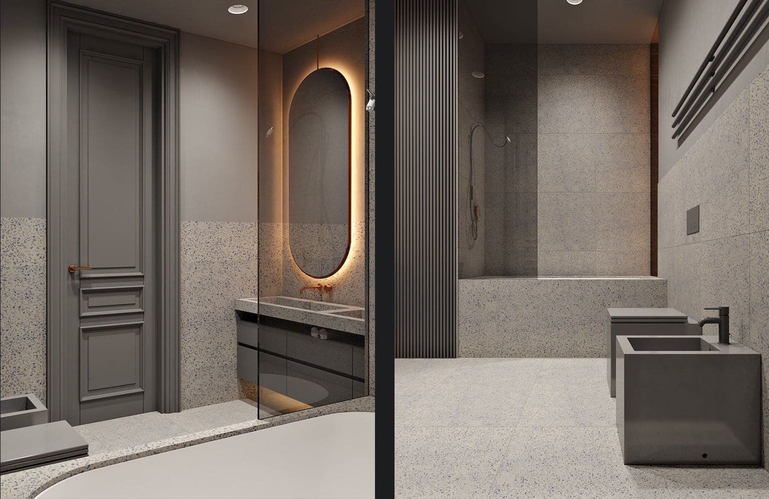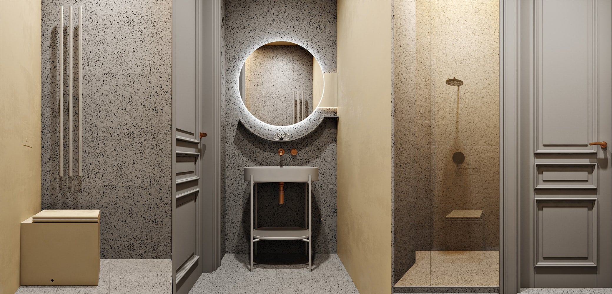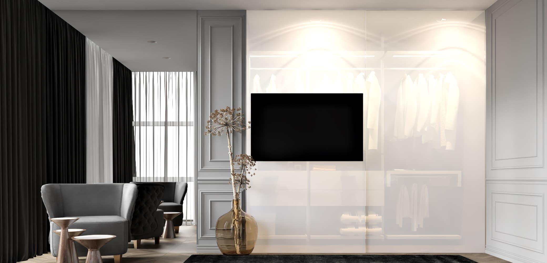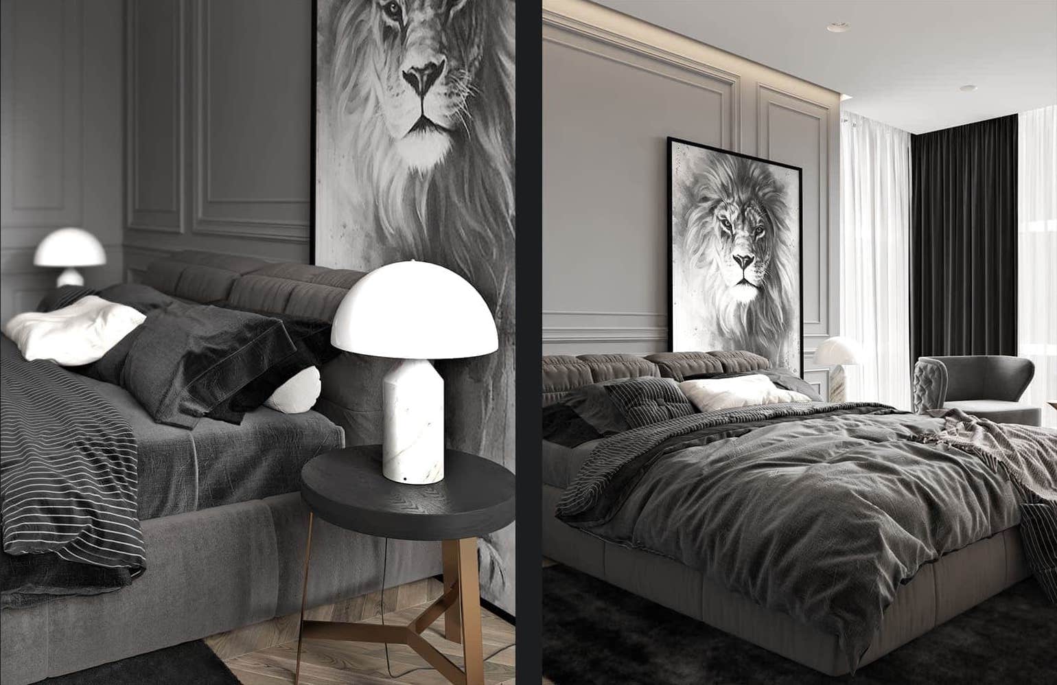 Klasyka spotyka nowoczesność. Wysokie stropy pozwoliły stworzyć unikatową kompozycję surowych kolorów i klasycznej sztukaterii, sprawiając, że cala przestrzeń stała się monumentalna.