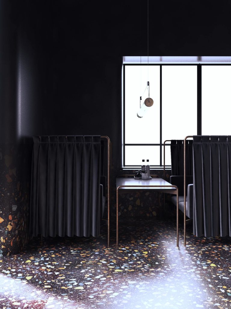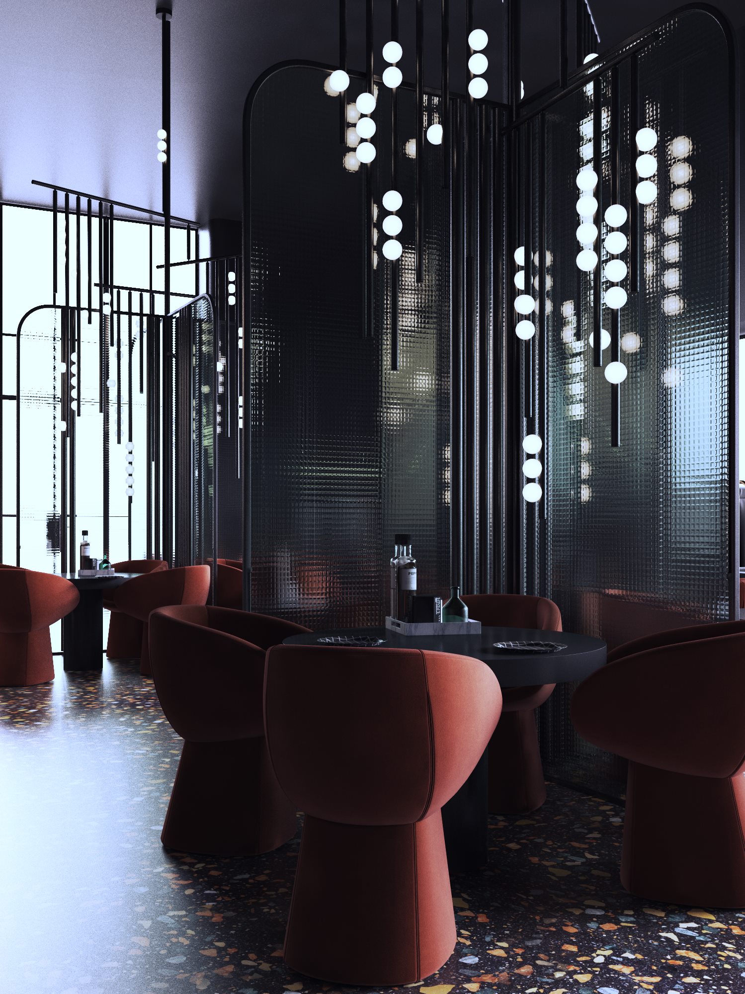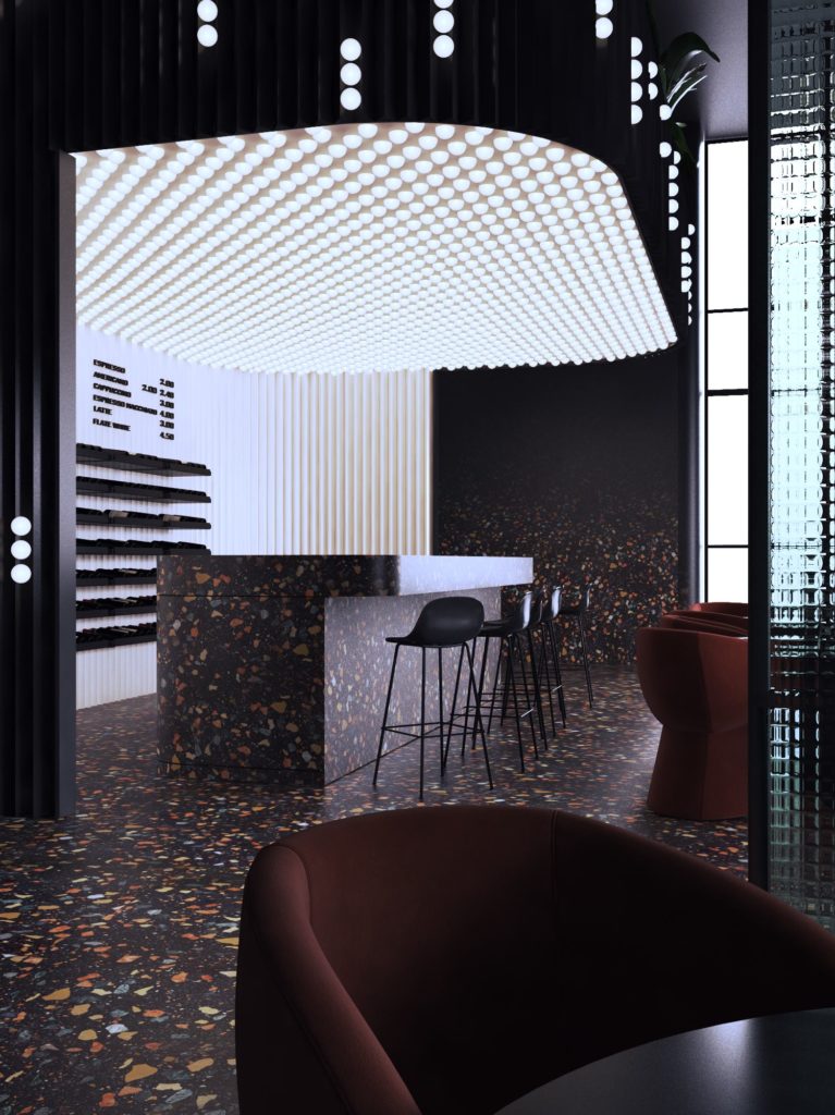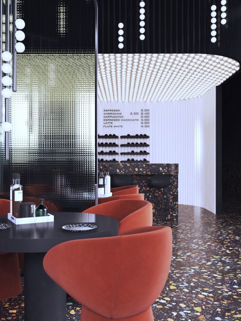 Bezszwowa wenecka mozaika podłogowa, krzesła akcentujące i załamujące światło przez reliefowe szkło, podkreślają wyjątkowość i przekonujący charakter tego lokalu.