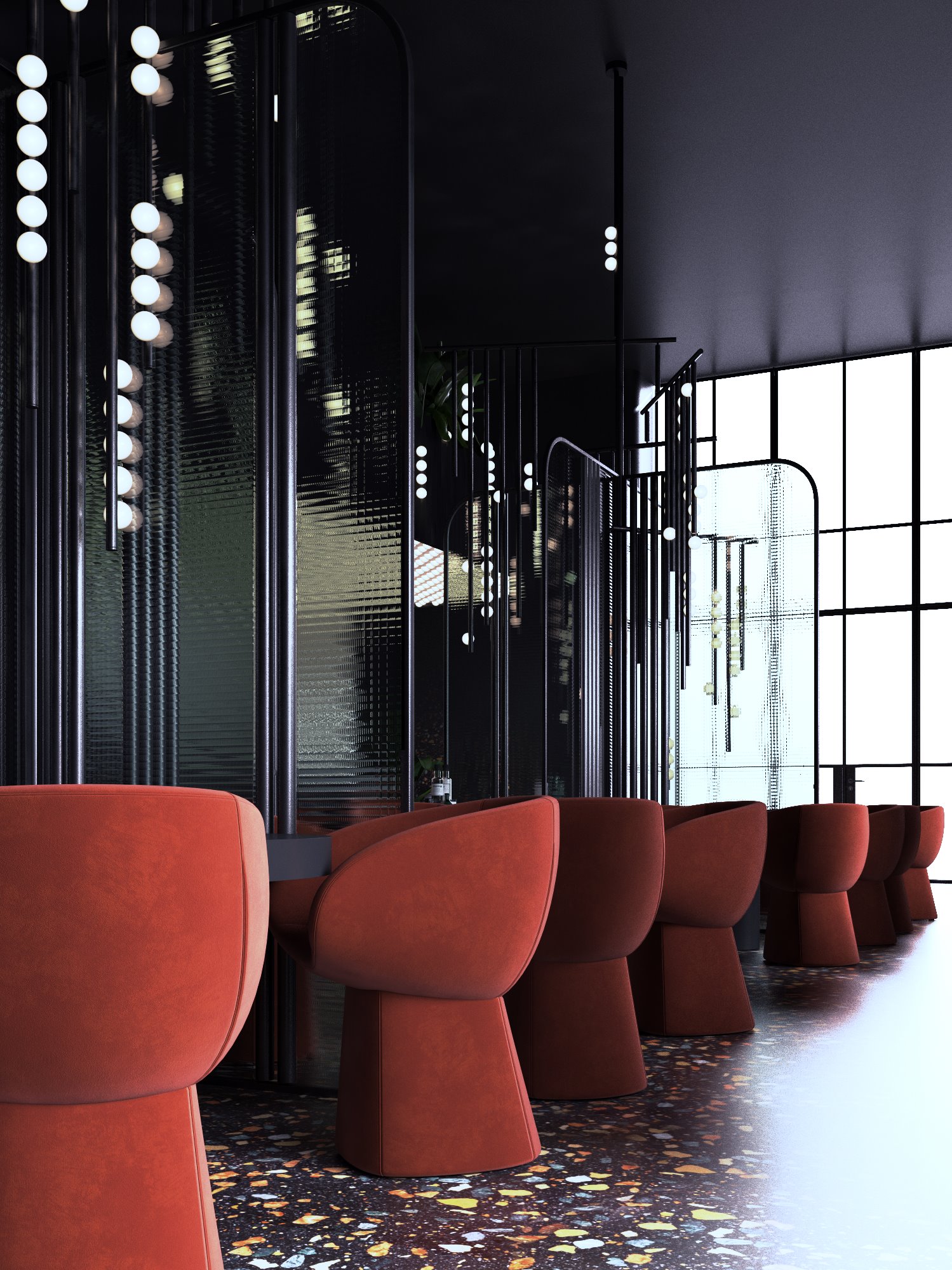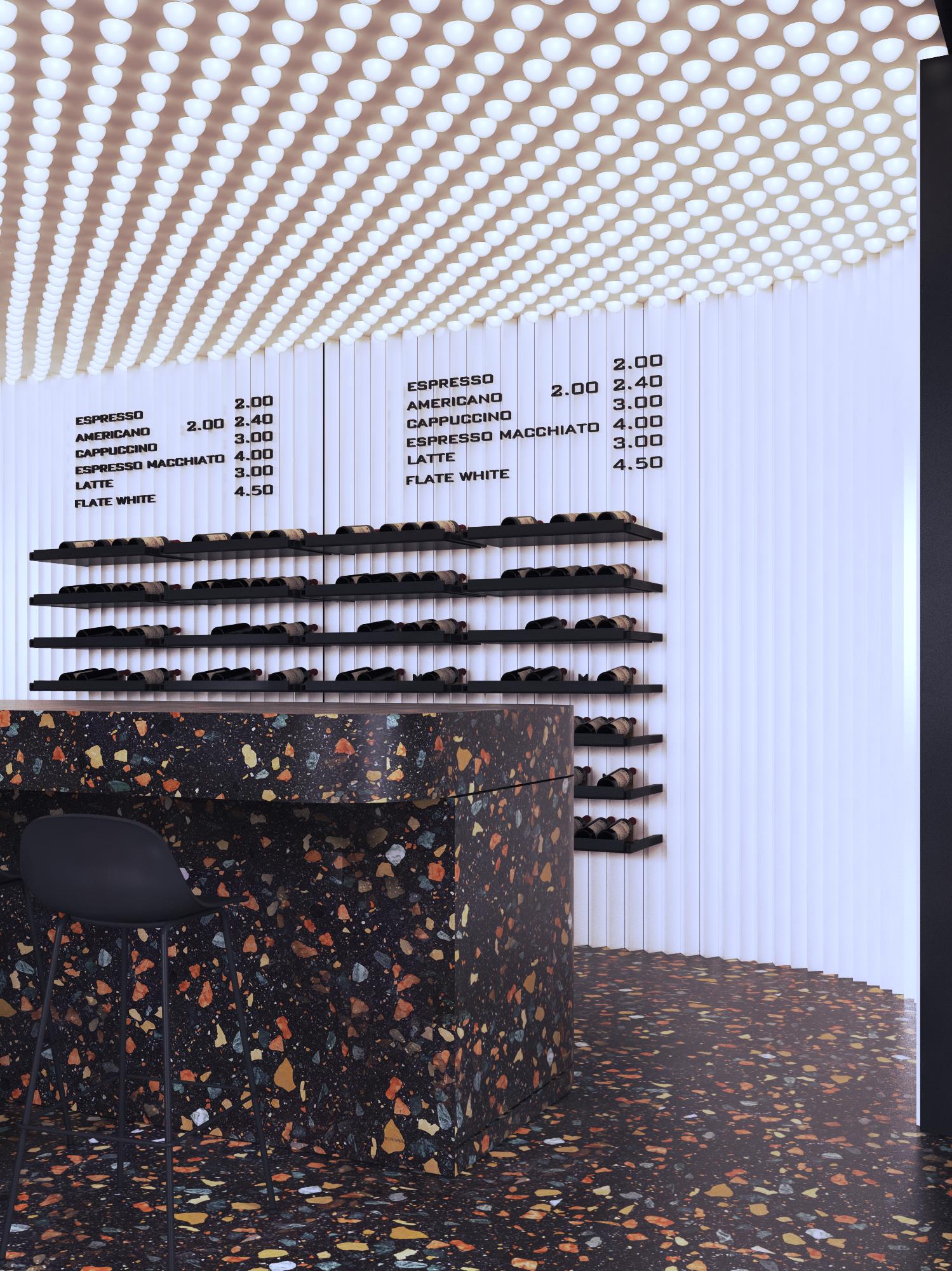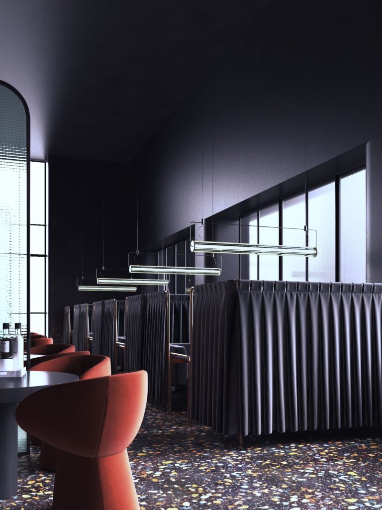 Bezszwowa wenecka mozaika podłogowa, krzesła akcentujące i załamujące światło przez reliefowe szkło, podkreślają wyjątkowość i przekonujący charakter tego lokalu.