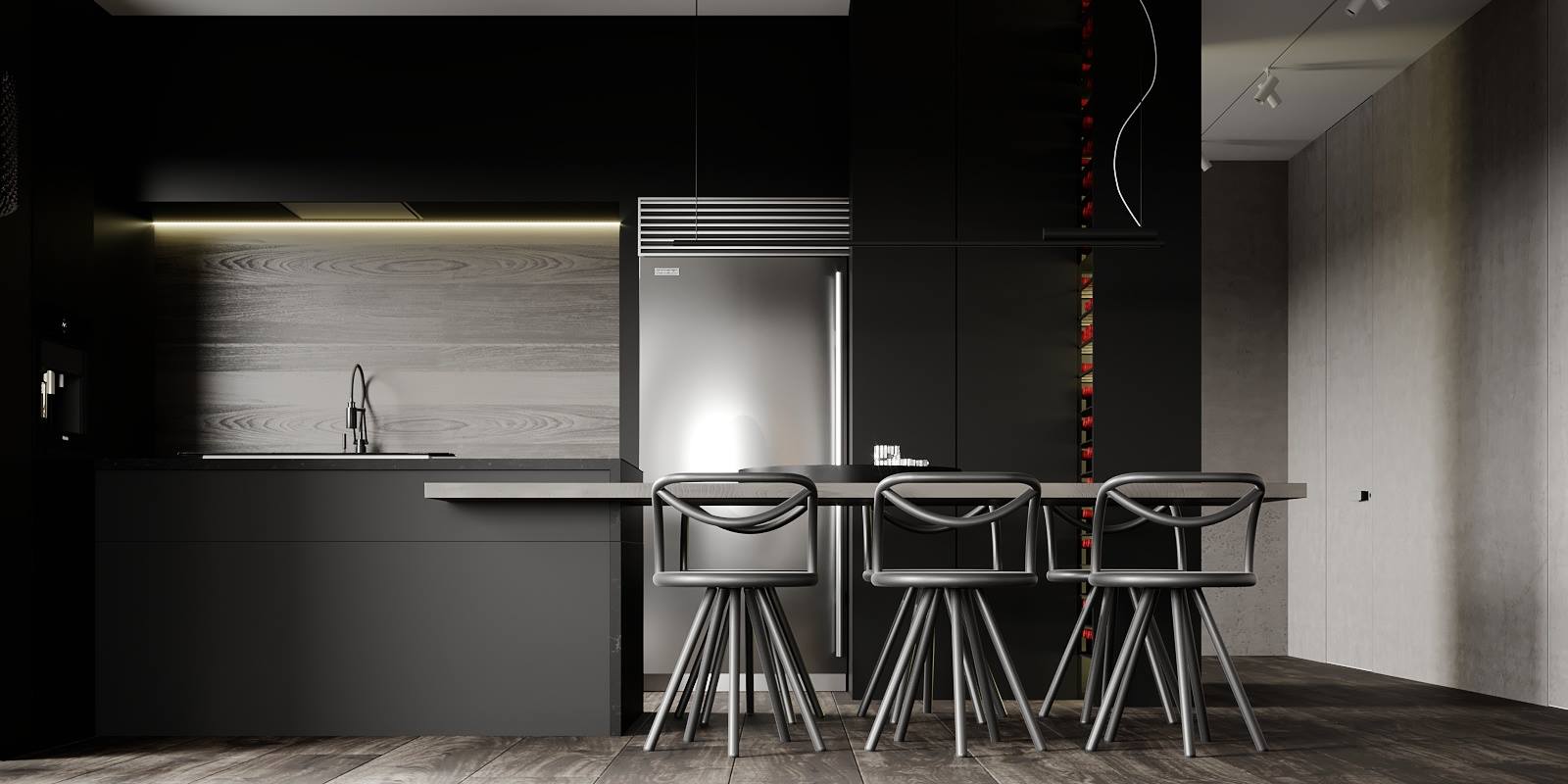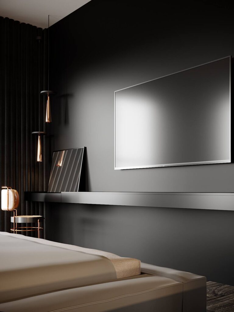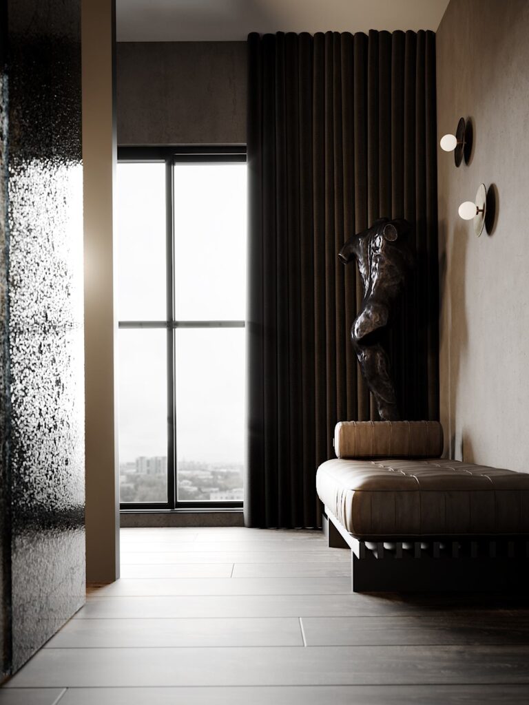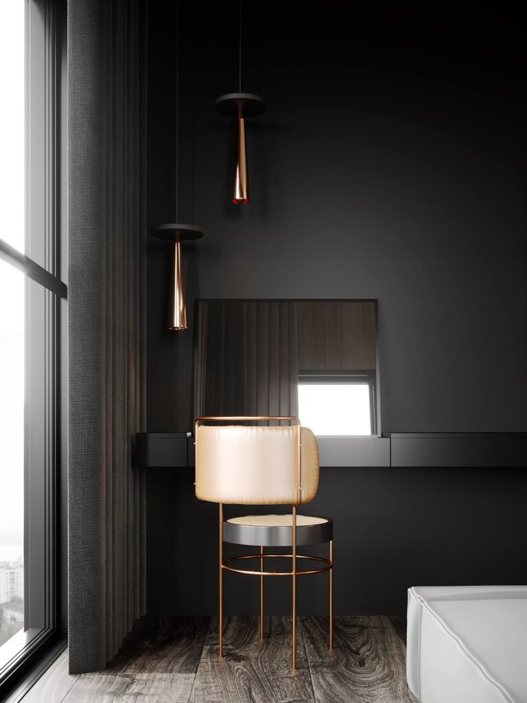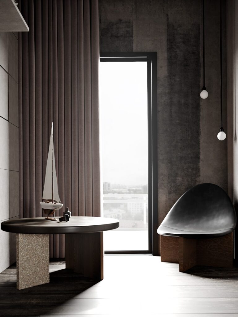 Projekt wykonany w typowo męskim stylu z elementami minimalizmu – przestronne otoczenie, celowo wyeksponowana faktura z solidnych materiałów wysokiej jakości. To asertywność, celowość, poczucie wszechwładzy połączonej z naturalnością i wdziękiem.