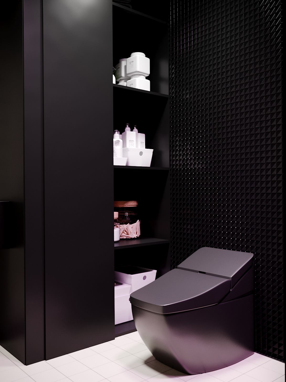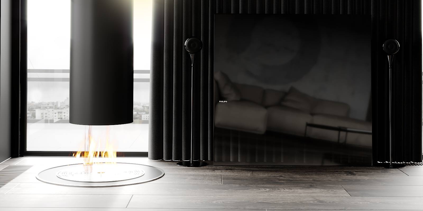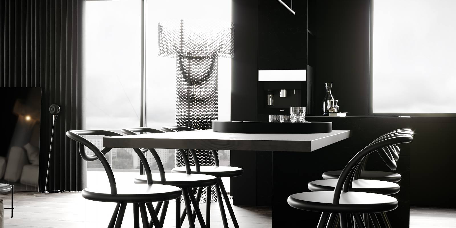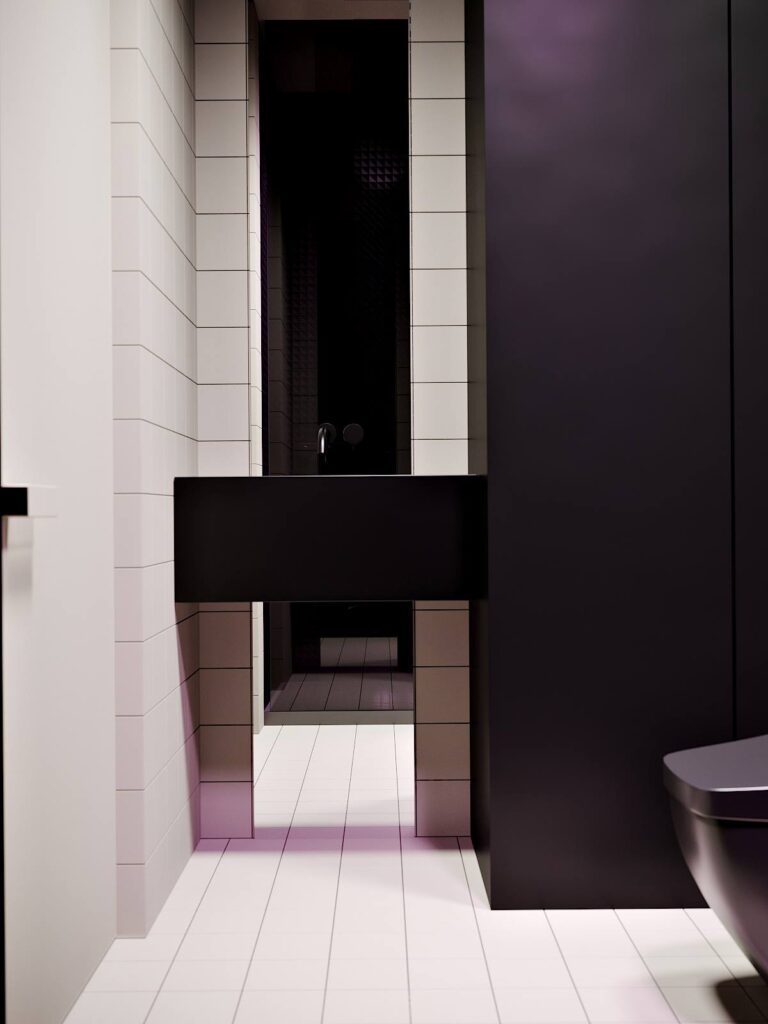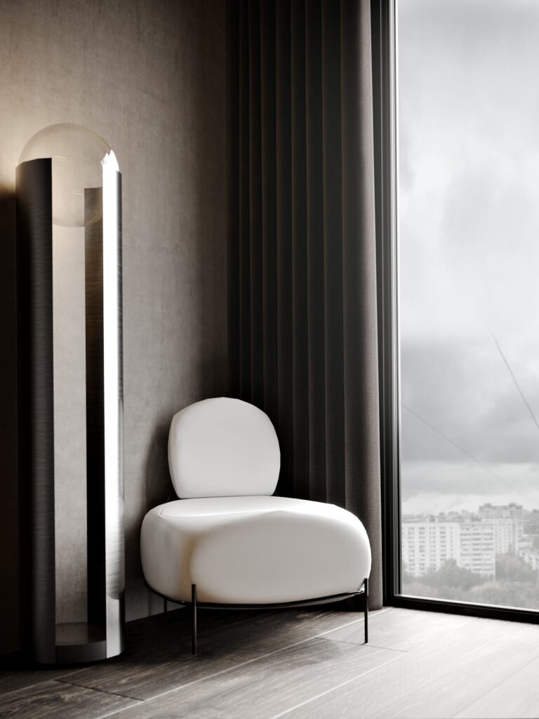 Minimalistyczny i ascetyczny charakter pomieszczeń przełamywany jest przez delikatne dekoracje. Takie jak oświetlenie, czy elegancka rzeźba.
